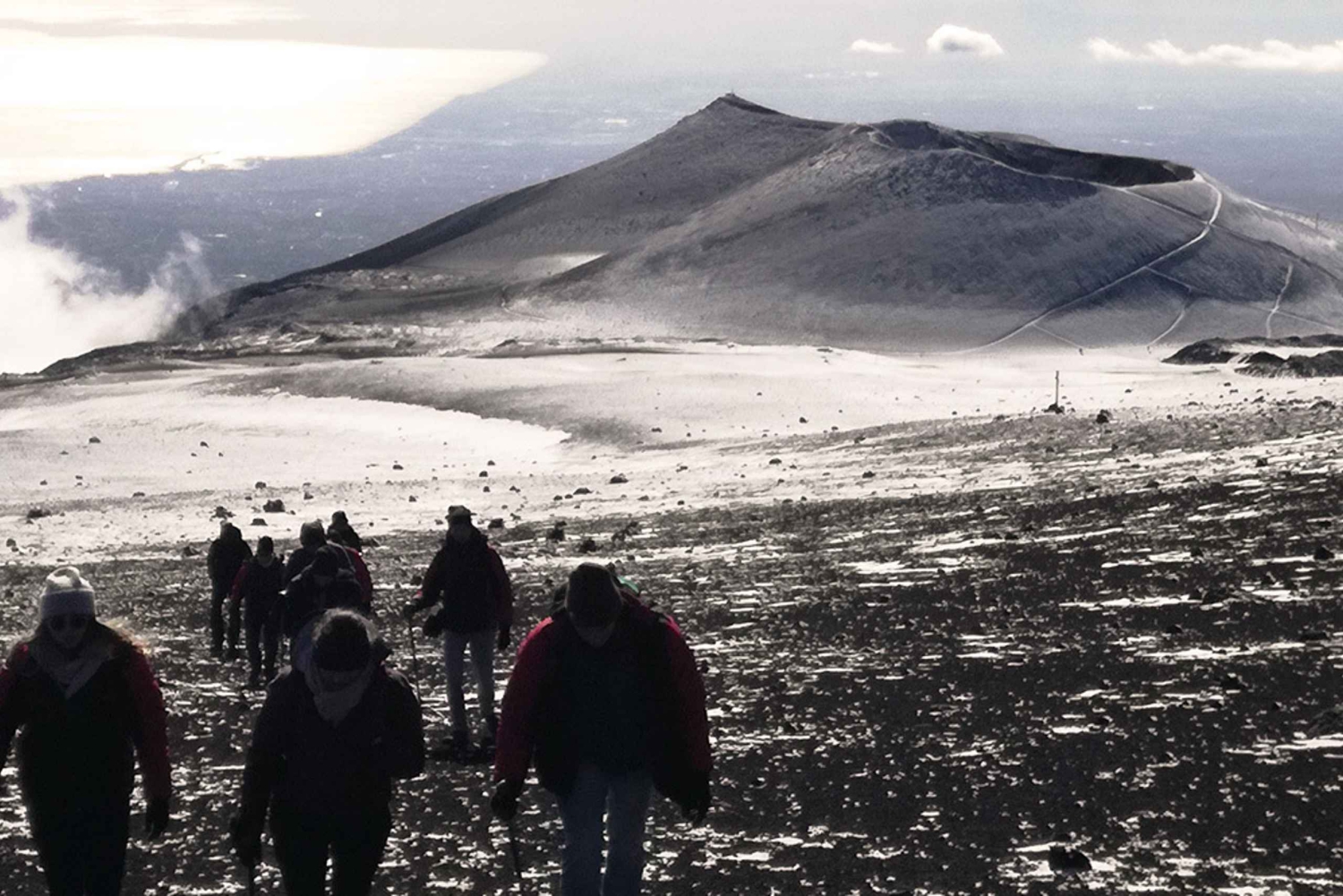 Diese Exkursion von bemerkenswerter Schönheit wird von autorisierten alpinen/vulkanologischen Guides geführt. Die Gruppen sind sehr klein, damit der Ausflug sicher und intim ist. Erlebe die Winterlandschaft des Ätna auf einer Tour für erfahrene Wanderer. Du fährst mit einer Seilbahn und steigst bis auf etwa 3.000 Meter Höhe auf. Vom Ashàra-Infopunkt am Piazzale Rifugio Sapienza fährst du mit der Seilbahn auf eine Höhe von 2.500 Metern. Von dort aus startest du die Wanderung auf etwa 3.000 Meter. Das Vorhandensein von Eis und Schnee macht diesen Ausflug zu einer lustigen Herausforderung für erfahrene Wanderer. Du wanderst über weite Strecken durch Schnee und besuchst den Kegel des Ausbruchs von 2001, das Valle del Bove und die Barbagallo-Krater. Bewundere den Gipfelkrater des Ätna aus sicherer Entfernung, bevor du dich auf den Rückweg machst. Wenn die Schneeverhältnisse es zulassen, besuche einen Lavakanal, bevor du die Bergstation der Seilbahn erreichst, mit der du zurückfährst.>Includes