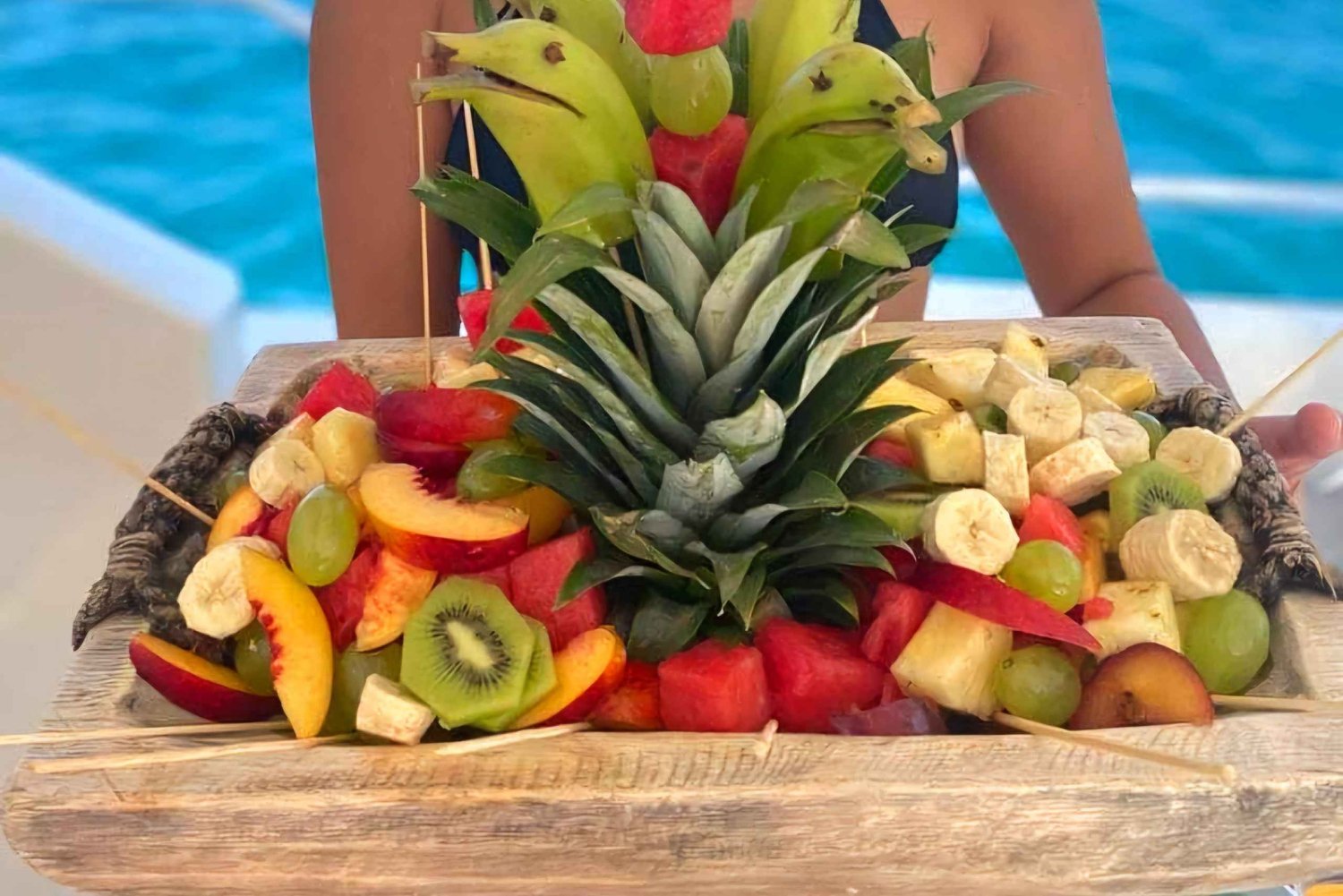 Spritz aperitif with appetizers. Two-course lunch per person served at the table. Choice of drinks: DOC Grillo white wine, Moretti beer, cola, mineral water. Coffee, limoncello, and desserts. Fresh fruit in the afternoon. Water relaxation equipment and items: air mattresses, SUP paddleboards, snorkeling vests. Free photo service. JBL Bluetooth music. Exclusive indoor toilet. Exclusive indoor cabin. Continuous assistance. Food for severe food intolerances.Easy cancellation
