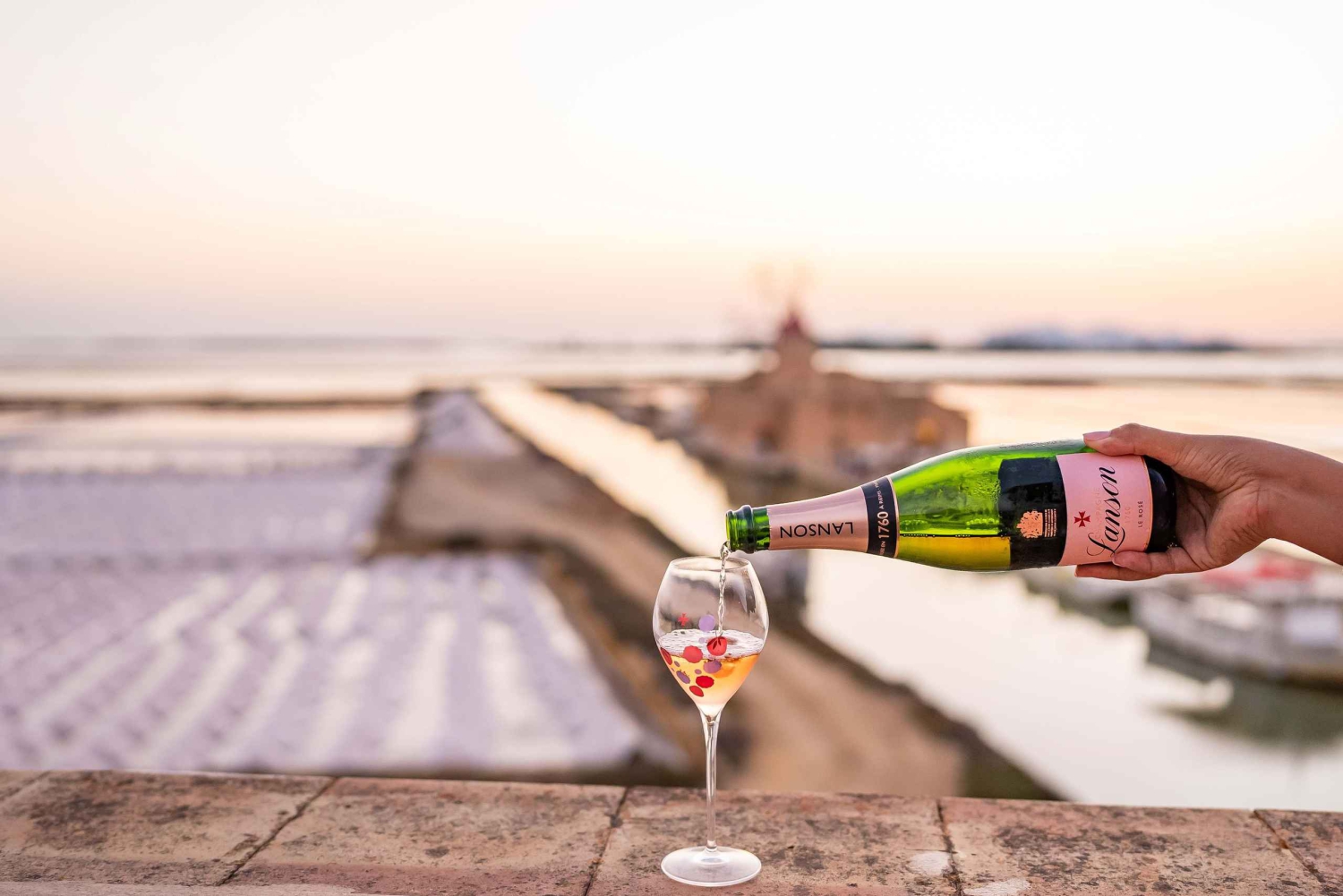 14 ReviewsAperitif at Mamma Caura Rooftop inside the salt pans SEI - Saline Ettore e Infersa, elegance, tranquility and beauty of the life during the sunset with sicilian tapas and a glass of Champagne Lanson.