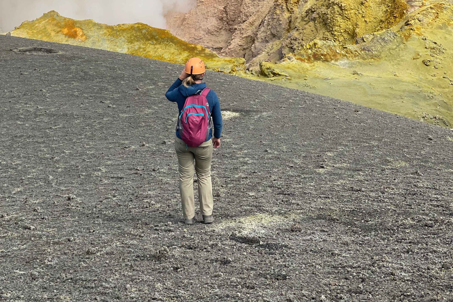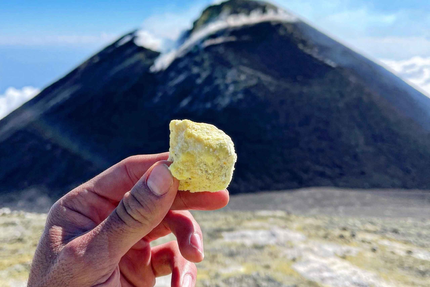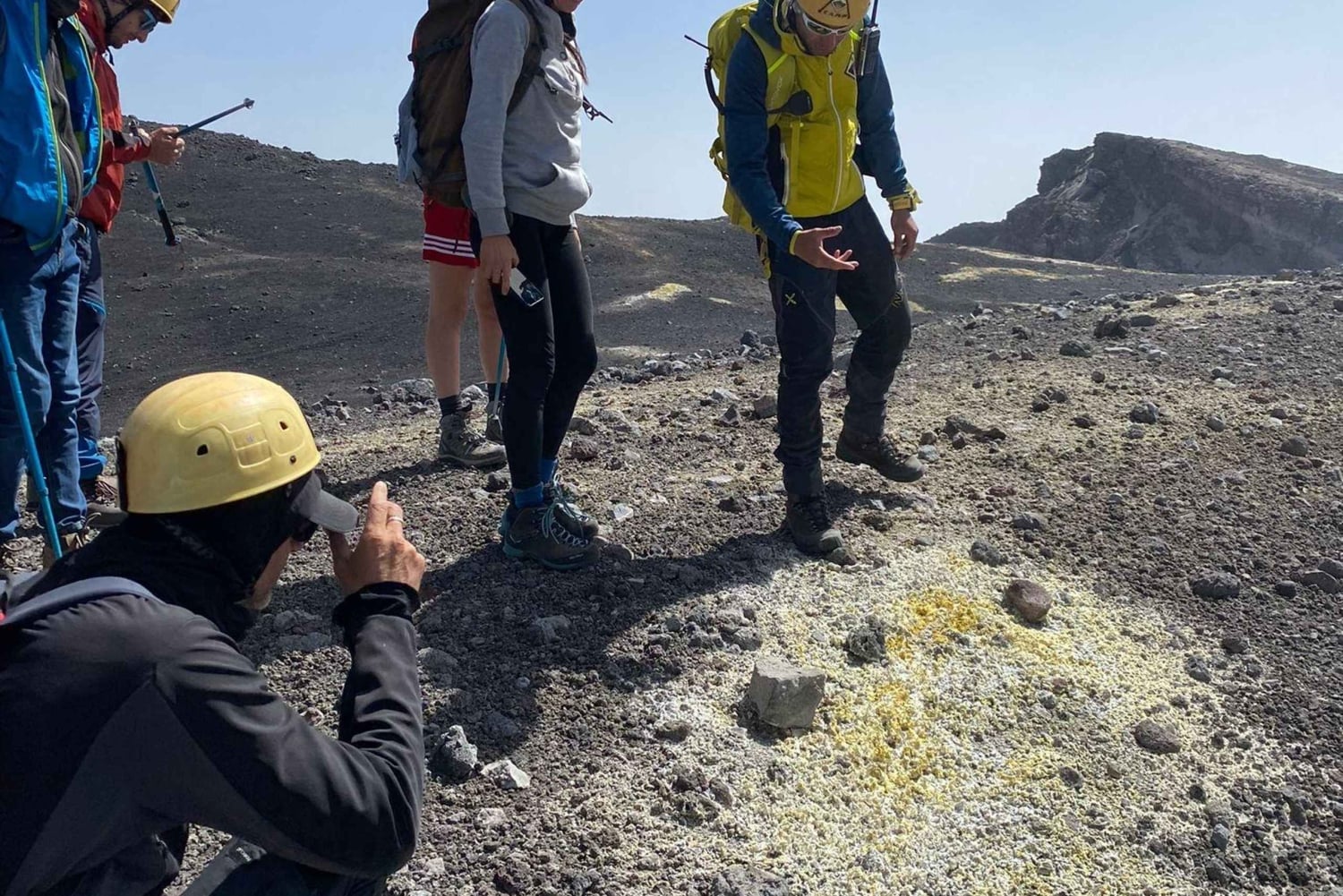 Set off on a grand, one-of-a-kind adventure on Mount Etna, with spectacular features suitable for expert hikers. Discover volcanology with your licensed volcanological guide and immerse yourself in the evocative natural scenery among the lava flows of Etna. From the meeting point, which has an altitude of 1800 meters, go up on special 4x4 vehicles along the 8-kilometer-long panoramic road of the north side of the volcano up to a height of 2,825 meters. From this point, begin the 5 km uphill walk on a path surrounded by volcanic slag and large bombs to the edge of the great Central Crater of Etna. The total uphill altitude difference is 490 up to the edge of the main crater of Etna at 3,315 meters. Once there, stop to admire the grandeur and magnificence of the processes associated with the volcanic environment: gas emissions and low- and high-temperature fumaroles surrounded by the brilliant colors of the sublimates. Enjoy the rooftop view of Sicily if weather conditions or the amount of volcanic gas emissions permit. After admiring the spectacle of the summit, begin your journey downhill along the slag and volcanic ash slopes, to the base of the Volcanological Observatory, where you stop for lunch. Then, continue inside one of the large sandy channels, characteristic of the northeast side of the volcano. Surrounded by endemic plants and seasonal streams, you will reach the downhill path to Piano Provenzana, the endpoint of the excursion. The total time of the trekking route is 5 to 6 hours and the total kilometers (round trip) are 12 km of which 5 km is uphill and 7 km is downhill (variable values). The difficulty level is for experienced hikers accustomed to regularly going to the mountains. The maximum reached altitude is 3,315 m while the minimum reached altitude is 1,800 m. The downhill altitude difference is 1,500 m (may vary).The long descent could be harder than the climb, as you descend 1500 meters of negative altitude, from an altitude of 3300 meters to an altitude of 1800 metres, strongly not recommended for those who suffer from joint problems and especially knee problems!.Includes