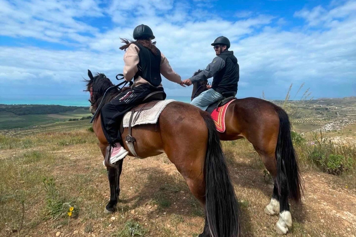 Ready to ride with us? Romantic escape on horseback in the Torre Salsa Nature Reserve. In the saddle, you will explore breathtaking landscapes, immersed in uncontaminated nature. This experience offers a perfect combination of adventure and romance, allowing you to experience unforgettable moments with your loved one. Prepare to be amazed with this 1-hour horseback ride between Belvedere and the Torre Salsa Nature Reserve, one of the most beautiful reserves in Sicily and a WWF oasis. Savor the sense of freedom and also an exquisite tasting of local cheeses and products! What will we do? We will meet at the riding school in Montallegro (AG), at the time selected when booking. Here we will meet the guide who will accompany us along the entire route. After having made friends with the docile horses of the riding school and having given a briefing on safety regulations and basic horse riding techniques, we will be ready to leave for this unforgettable experience. We will enter the Torre Salsa Nature Reserve, one of the most beautiful WWF oases in the area. Where our eyes will be enchanted by this splendid landscape. We will proceed at pace to discover paths immersed in vegetation, panoramic points and many other magnificent views. After riding for about 1 hour, we will continue towards the riding stables. Here a tasting of KM0 cheeses awaits us, accompanied by bread, oil, wine and water. Who is it aimed at? The activity is suitable for everyone, from 15 years old. The weight limit to participate is 100 kg. For minors, an authorization signed on site by the parents is required. The experience is easy, no previous horse riding experience is required to participate. INCLUDES: HELMET “FOR CHILDREN” BODICE DOES NOT INCLUDE: INSURANCE TO BE PAID ON THE SPOT €3Includes