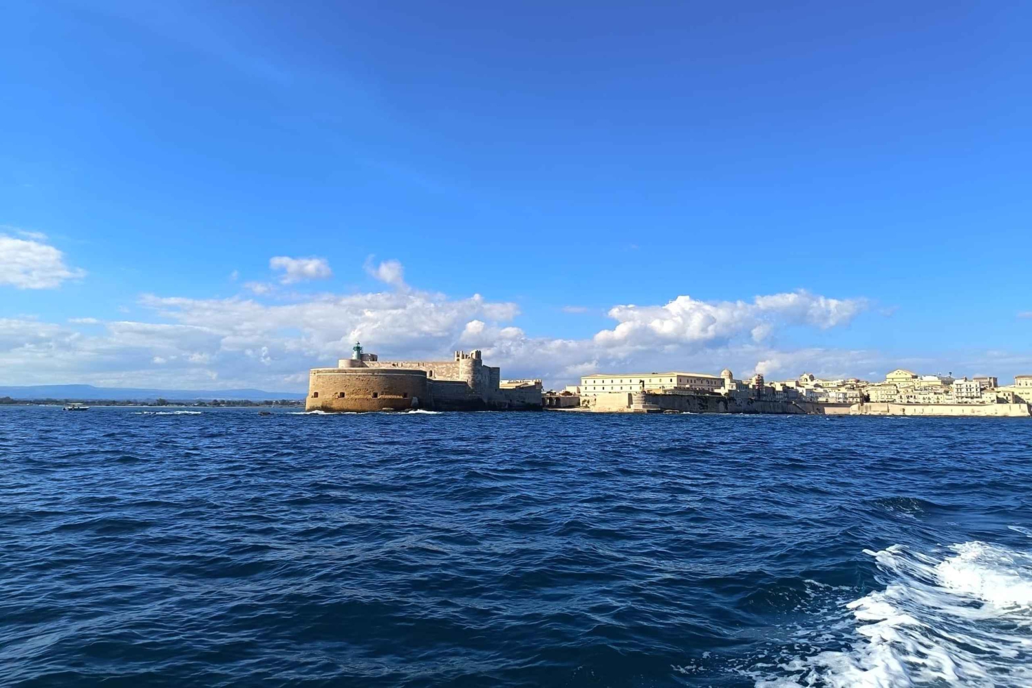 Set sail from the small port of Siracusa, Porto Santa Lucia, named after the city’s patron saint. Cruise past the Monumento ai Caduti and the striking Roccia del Delfino, where the azure waters reveal the unique colors of the Siracusa seabed. Continue to the Grotta dei Cappuccini, Grotta del Corallo, Grotta degli Innamorati, and Grotta dello Spirito. Head to the Golfetto dei Due Frati, where you’ll learn the legend of the two rocks and see formations resembling a camel and an elephant. Next, sail to the Plemmirio area, particularly the Spiaggia della Pillirina, a natural zone. Admire the minaret, an abandoned tuna factory, and a mussel, clam, and oyster farm, home to the largest oysters on Sicily’s east coast. On the return journey, admire the Chiesa del Santo Spirito, the Academy of Architecture, and the Castello Maniace. Enter one of the world’s largest natural harbors, the Porto Grande di Siracusa, and see the Fonte Aretusa and the Marina. Finally, see the magnificent bridges of Siracusa: Ponte Umbertino, Ponte Santa Lucia, and Ponte Nuovo, which connect the old city (ortigia ) of Siracusa to the new. Enjoy a 30-35 minute swim stop, with snorkeling. Relax with music, the boat got a shower, a table, a portable fridge, and a sunshade at your disposal.Includes