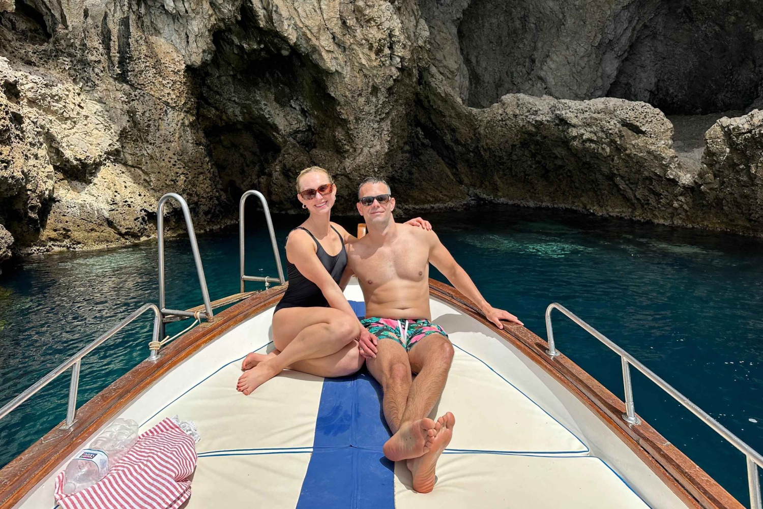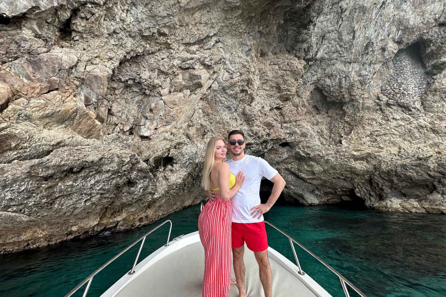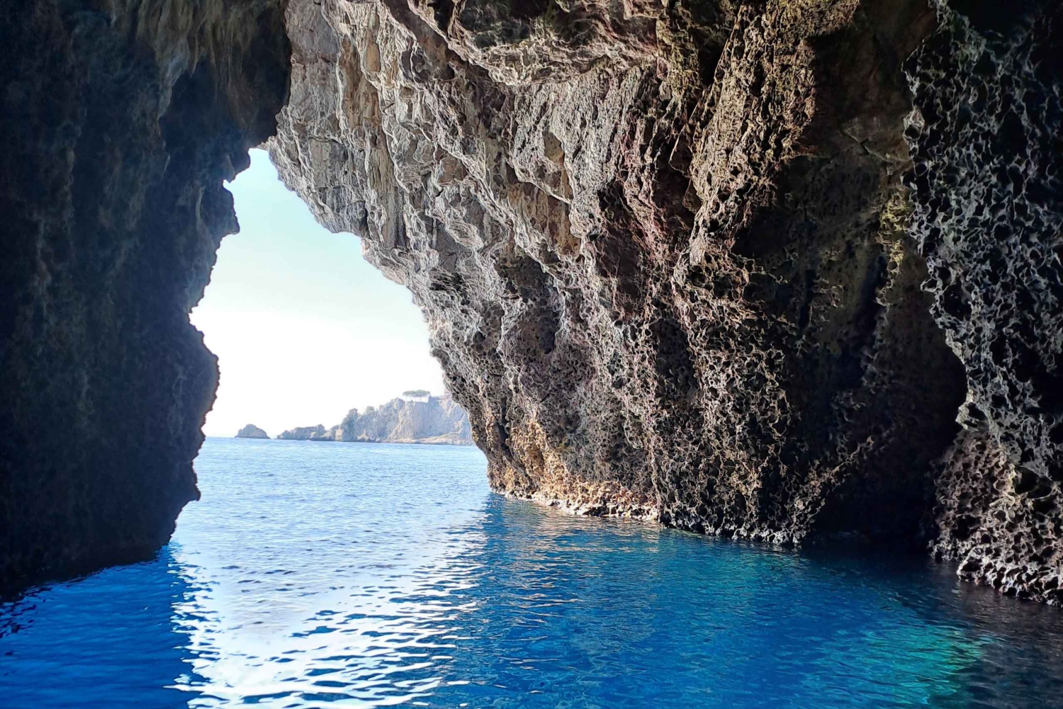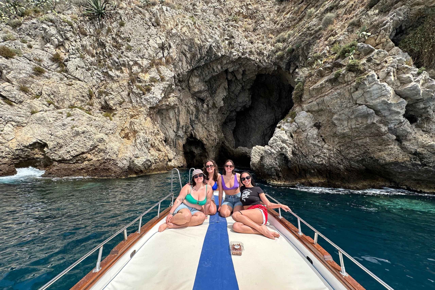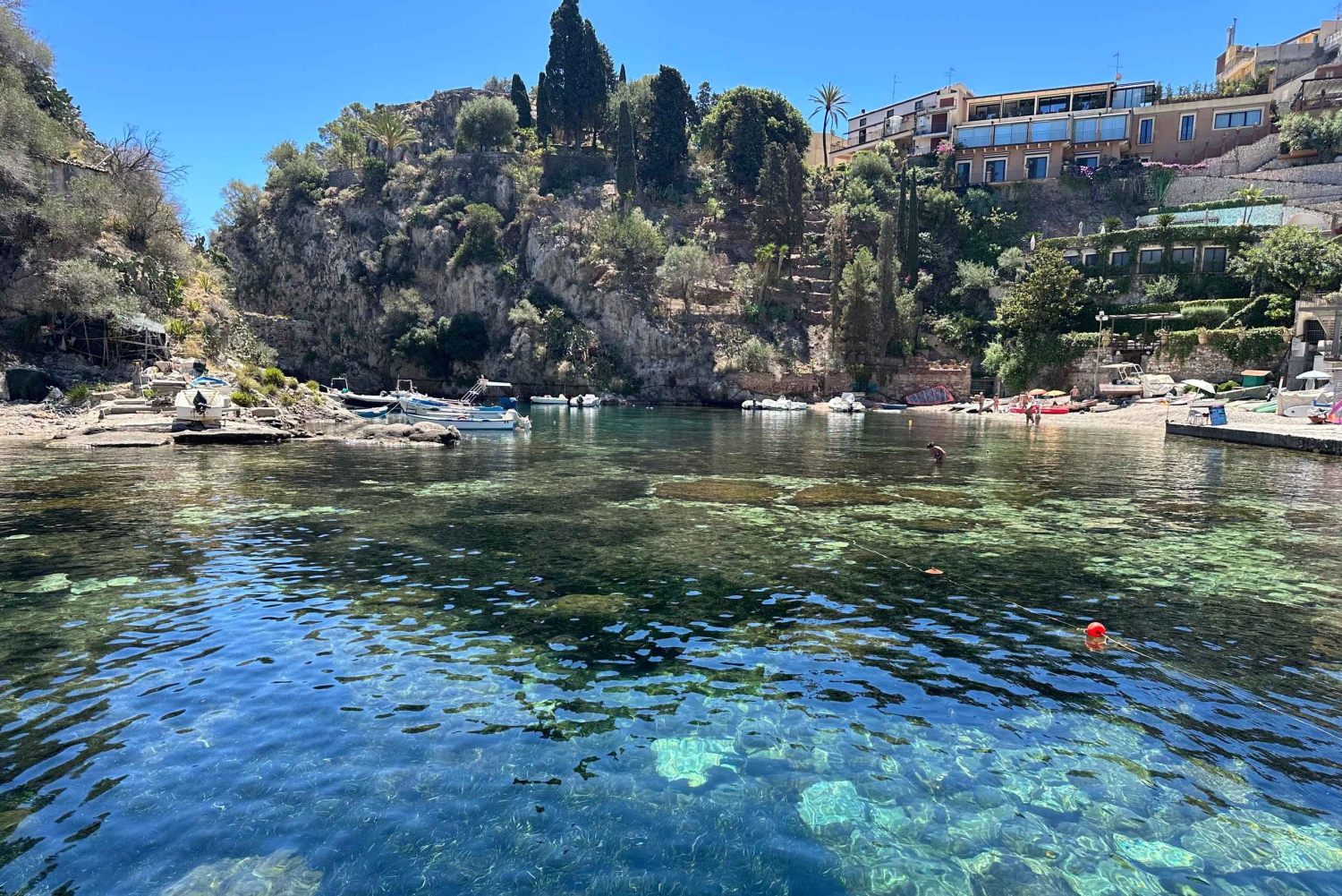Quittez la baie et naviguez le long d'eaux cristallines, en admirant des lieux emblématiques tels que l'Isola Bella, la Grotte bleue, ainsi que les falaises spectaculaires et les criques cachées qui rendent ce littoral si unique. Découvrez la magie du littoral de Taormine lors d'une sortie en bateau partagée de quatre heures, idéale pour les voyageurs qui souhaitent se détendre, explorer et profiter de vues imprenables sur la mer. En chemin, écoutez votre skipper partager des curiosités sur la région pendant que vous vous arrêtez pour nager et faire du snorkeling dans les baies les plus belles et les plus exclusives de la côte. Profitez de temps libre dans l'eau ou détendez-vous simplement sur le pont et profitez du soleil sicilien. Savourez un délicieux apéritif à base de produits locaux préparé par votre capitaine, avec différents types d'amuse-bouches accompagnés de vin local, de boissons sans alcool, de prosecco et d'eau. Cette expérience offre une occasion unique de socialiser, de partager des histoires et de profiter ensemble de la beauté de Taormine. Idéale pour les couples, les amis et les voyageurs solitaires, cette expérience partagée allie confort, plaisir et beauté naturelle, offrant une manière inoubliable de découvrir Taormine depuis la mer.Includes