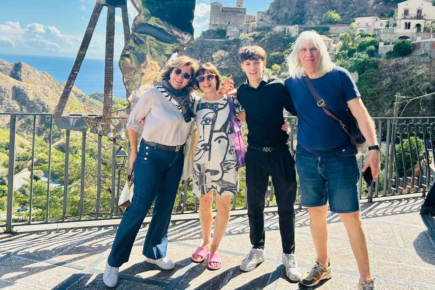 La visite se poursuit vers Savoca, l’un des plus beaux villages d’Italie, où vous vivrez un moment de pur charme : le tour en Ape « La Dolce Vita ». En partant du légendaire Bar Vitelli, où vous pourrez admirer les vestiges historiques du plateau, vous vous laisserez transporter dans les ruelles panoramiques jusqu’à l’église de San Nicolò, lieu du célèbre mariage entre Michael et Apollonia. Une manière emblématique, amusante et sans effort de respirer l’atmosphère du film, immergé dans un panorama à couper le souffle.