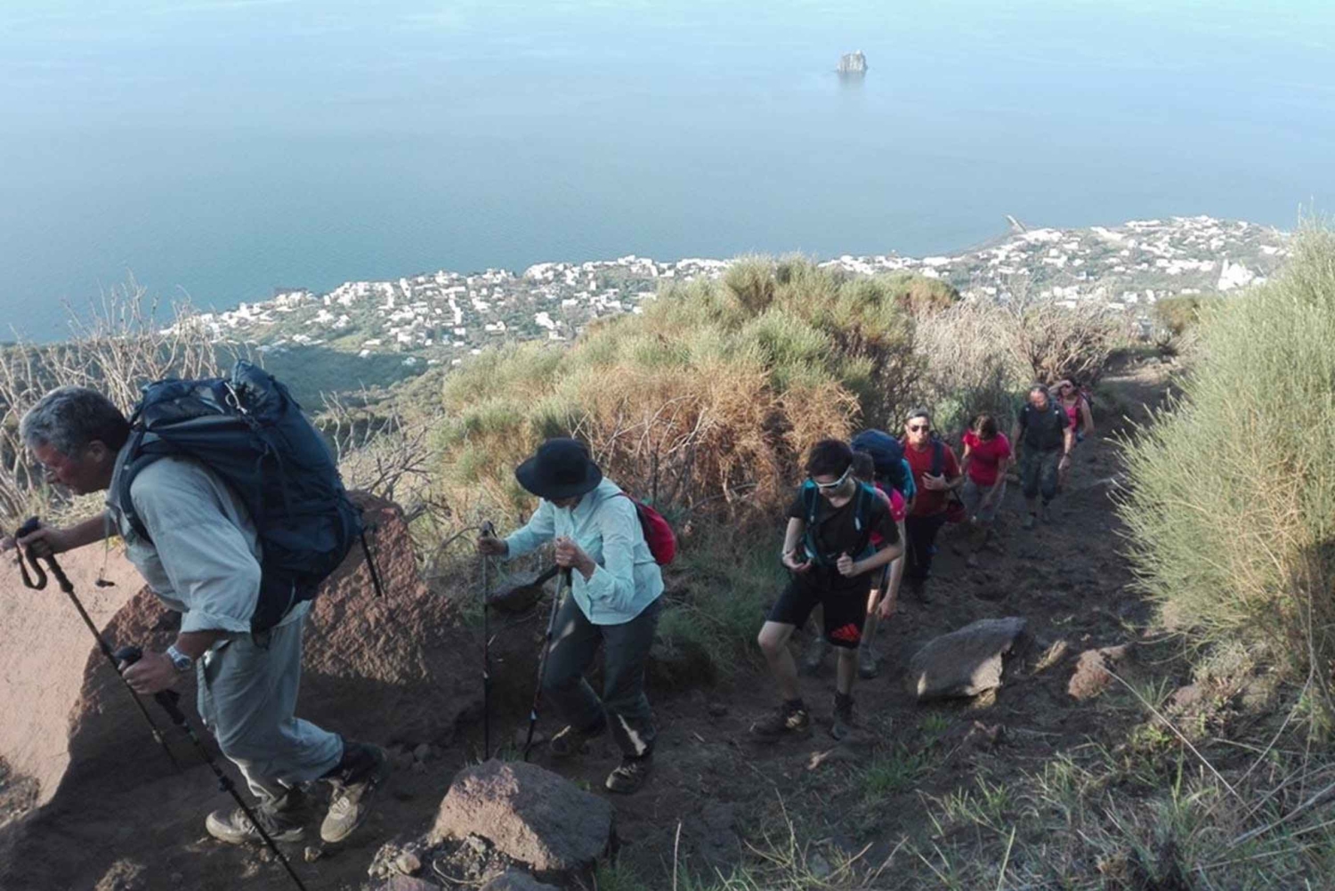 L'excursion commence directement au village, après un court moment, nous atteignons le 'vieux cimetière', un petit groupe de tombes datant du début des années 1900, immergé dans la végétation luxuriante, en grimpant le long d'un beau sentier, nous atteignons une altitude de 400 mètres au-dessus du niveau de la mer. De là, nous pouvons observer en toute sécurité les fascinantes explosions des cratères à une distance d'environ 350/400 mètres à vol d'oiseau et la fameuse 'Sciara del Fuoco'. Après une longue halte, nous retournons au village par le sentier muletier de Punta Labronzo.