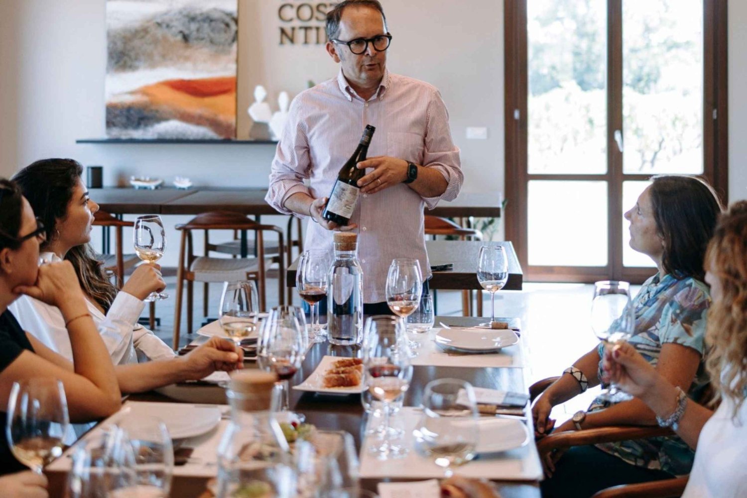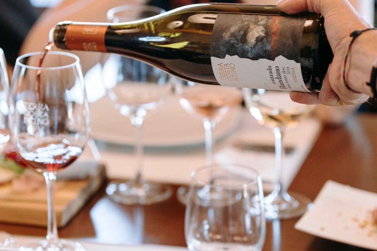Visite guidée de la cave (cave souterraine, anciens outils de vinification, barriques modernes) Dégustation de 3 vins biologiques AOC Etna (blanc, rosé, rouge) Pain traditionnel de l'Etna avec huile d'olive du domaine Accès à la terrasse panoramique surplombant les vignobles Promenade libre dans les vignoblesEasy cancellation