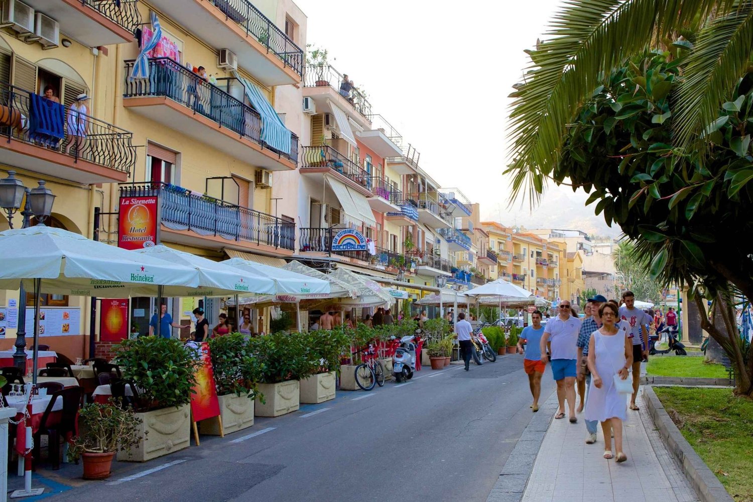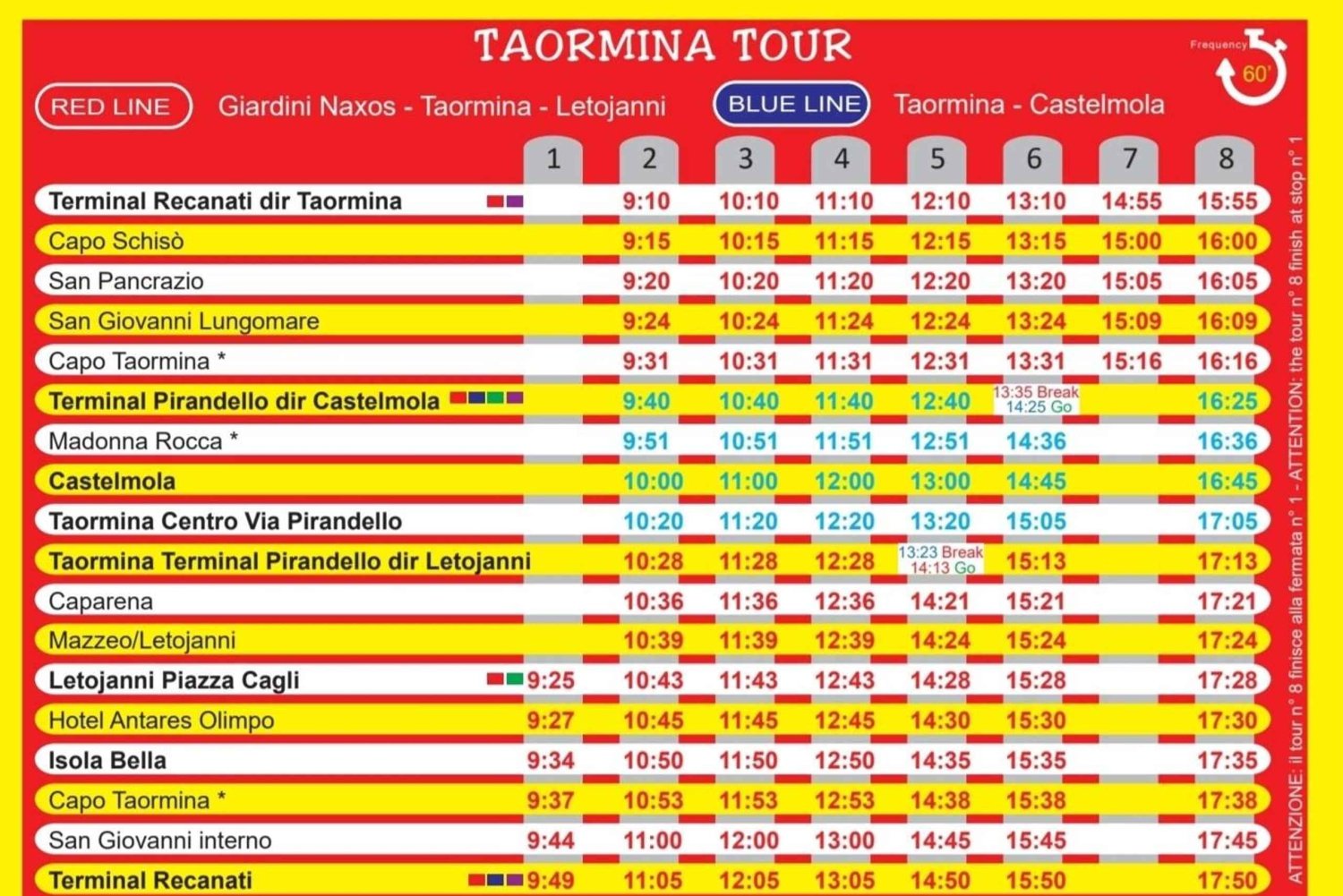 Scopri l'arte, la storia e la natura che circonda Taormina con questo tour Hop-on Hop-off. Esplora le città nel modo che preferisci, gestendo la tua vacanza come vuoi. Indossa le cuffie che ti guideranno nella lingua che hai scelto, permettendoti di uscire e ammirare il fascino e l'atmosfera dei luoghi che hanno reso famosa Taormina in tutto il mondo. L'itinerario del tour in autobus scoperto è il seguente: 1. Terminal Giardini Naxos Bus Recanati: h. 9:10 - 10:10 - 11:10 - 12:10 - 13:10 - 14:55 - 15:55 2. Terminal Bus Pirandello di Taormina: ore 9:40 - 10:40 - 11:40 - 12:40 - 14:13 - 14:25 3. Letojanni, Piazza Cagli: ore 9:25 - 10:43 - 11:43 - 12:43 14:28 - 15:28 4. Castelmola, Parcheggio davanti all'Hotel Villa Sonia: h. 10:00 - 11:00 - 12:00 - 13:00 - 14:45 5. Isola Bella, Parcheggio Funivia, Fermata CityBySee n. 15: ore 9:34 - 10:50 - 11:50 - 12:50 - 14:35 - 15:35. Orario allegato.Includes