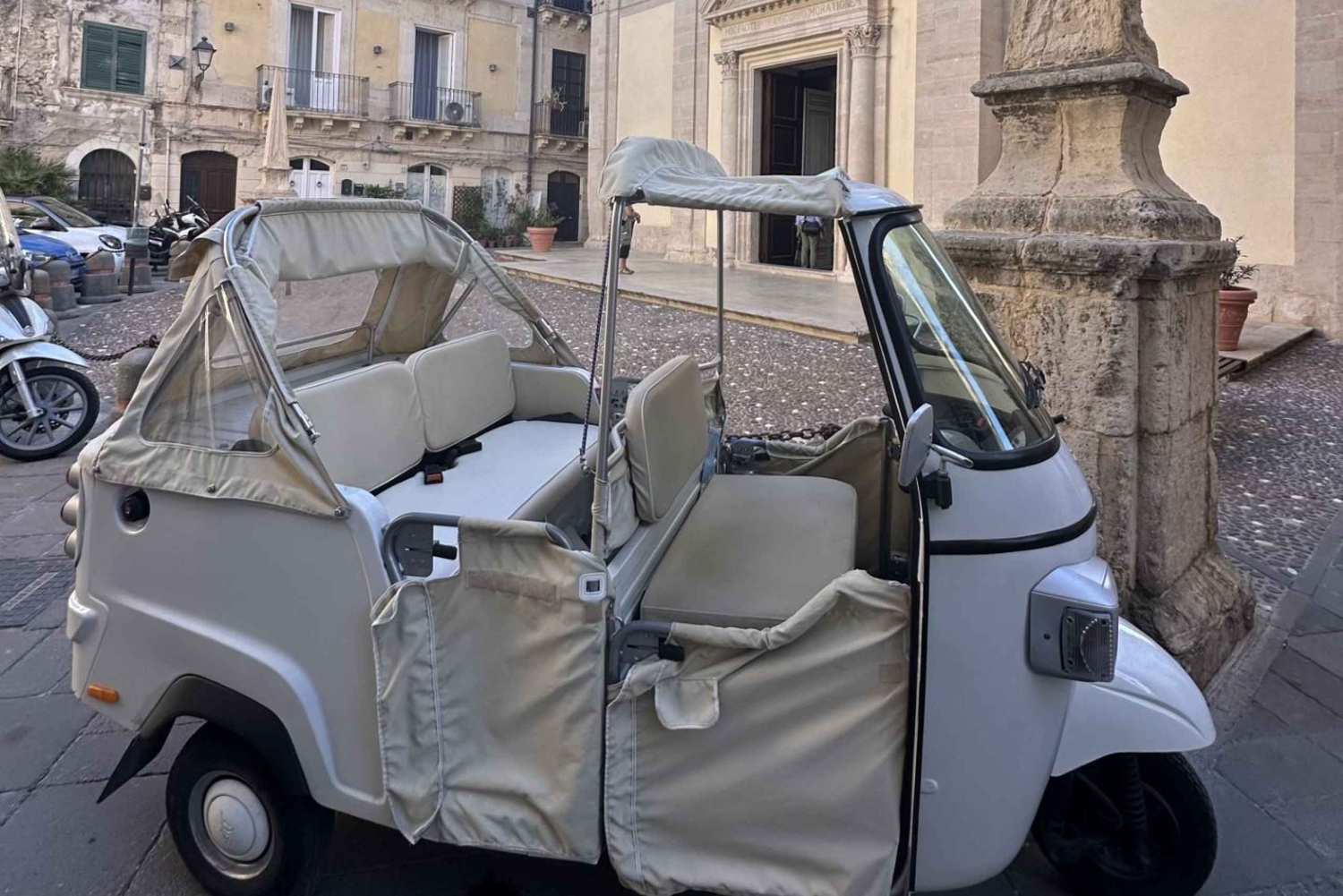 Durante l'Ape Calessino Tour a Ortigia, avrai l'opportunità di ammirare il maestoso Duomo di Siracusa (sosta di 15 minuti), la Fontana di Aretusa (sosta di 5 minuti), la terrazza del Castello Maniace (sosta di 10 minuti), il Tempio di Apollo, la Fontana di Diana a Piazza Archimede e il pittoresco Porto Grande. Lungo il percorso, l'autista condividerà affascinanti aneddoti sulla cultura siciliana, offrendoti una prospettiva autentica di questa affascinante isola. Un'esperienza indimenticabile per scoprire i tesori nascosti di Ortigia. Inoltre, i tour possono essere personalizzati a discrezione del cliente poiché la nostra tariffa è oraria.Includes