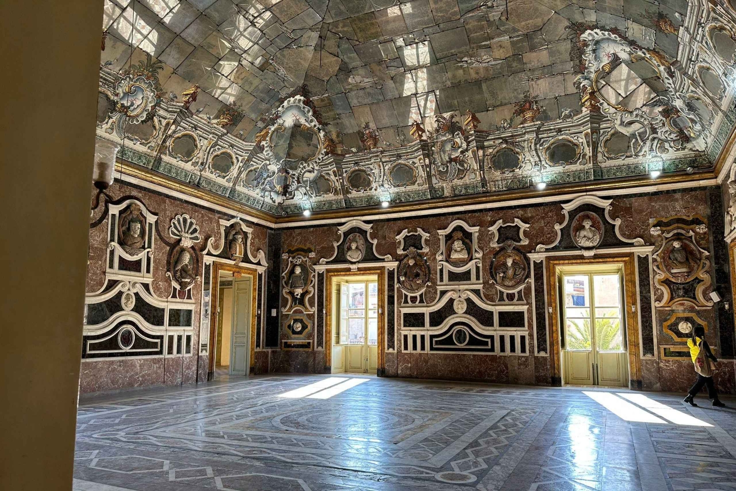 シチリア島バゲリアにあるバロック様式のヴィラ、ヴィラ・パラゴニアを探訪。ヴィラのユニークな建築を鑑賞し、その歴史について学びましょう。 シチリアで最もよく知られ、最も訪問されているモニュメントの1つであるヴィラ・パラゴニアを訪れます。ヴィラのユニークな建築を鑑賞し、その歴史について学びましょう。 1715年、パラゴニアの第4王子ドン・フェルディナンド・グラヴィーナとクルジュラスの命により建設が開始されたヴィラを見学。この別荘の設計を依頼されたのは、ドミニコ会の修道士トンマーゾ・マリア・ナポリ。 1737年に建設されたヴィラを囲む下半身をご覧ください。この別荘は1749年にフランチェスコ・フェルディナンド・グラヴィーナとパラゴニア公6世アリアータによって完成しました。 大通りのバリセントリックな軸線と協調して展開し、機能するすべての要素で構成された、この邸宅の驚異的な単一平面デザインをご堪能ください。邸宅の二重階段、グラヴィーナ家の壮麗な紋章をご覧ください。 メインフロアへは、18世紀後半の新しい趣味に敬意を表して、異母兄フランチェスコ・フェルディナンド2世の後継者であるサルヴァトーレ・グラヴィーナがヘラクレスの労働を描いたフレスコ画で飾られた楕円形の前庭からお入りください。 その右側には、天井全体が鏡で覆われた「鏡の回廊」があり、上空の欄干と幻想的な鳥を描いた絵画が飾られています。この大きな部屋の壁は、上質の大理石で飾られ、色ガラスと大理石の高浮き彫りには、別荘の創設者と「怪物」を注文した孫、それぞれの妻、グラヴィーナ家の先祖、ヨーロッパの支配階級の輝かしい人物が描かれています。 床には、シチリア18世紀の多色大理石で描かれた正確な図面があります。この大広間から礼拝堂に入り、その前にある「鏡の回廊」を横切ると、ビリヤード場に到着します。楕円形のエントランスホールから、邸宅のプライベート・アパートメントに向かいます。Includes