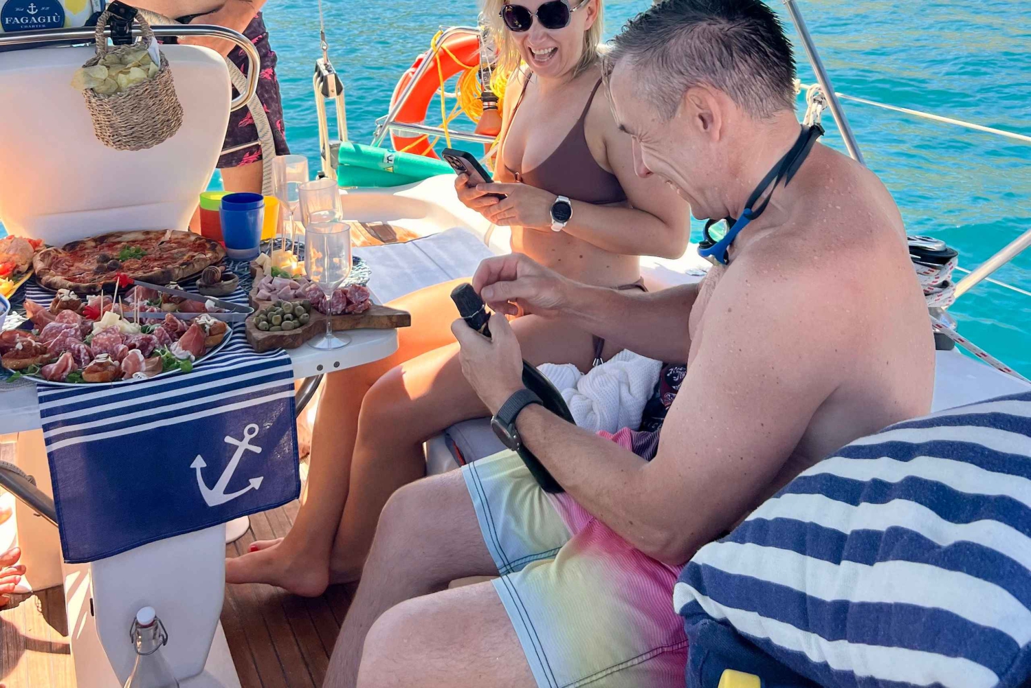 Ontdek de magie van het Zingaro-natuurreservaat met een onvergetelijke zeiltocht! We vertrekken vanuit de haven van Balestrate en varen langs de kust, waar we verborgen baaien en adembenemende landschappen ontdekken. Tijdens de tour maken we verschillende stops in de mooiste baaien, waar je een duik kunt nemen in het kristalheldere water en kunt snorkelen tussen de rijke zeeleven. Het hoogtepunt is de lunch aan boord, geserveerd voor de majestueuze rotsen van Scopello: een unieke ervaring, ondergedompeld in de ongerepte schoonheid van de Siciliaanse zee, vergezeld van lokale specialiteiten en Siciliaanse wijn. We varen verder terwijl we de historische Tonnara di Scopello en de ruige kust van het natuurreservaat Zingaro bewonderen. Onze ervaren bemanning staat altijd voor je klaar om je een exclusieve en ontspannen ervaring te garanderen. Als je wilt, kunnen we op verzoek vervoer van en naar de haven regelen, zodat je optimaal comfort geniet. Ga met ons mee voor een dag vol zee, natuur en authentieke Siciliaanse gastvrijheid! Duur van de ervaring: De cruise duurt ongeveer 8 uur, met vertrek vanuit de haven van Balestrate rond 10.00 uur en terugkeer om 18.00 uur. De tijd kan enigszins variëren afhankelijk van de omstandigheden op zee en het tempo van de groep, waarbij we altijd zorgen voor ontspannende stops om te zwemmen en te lunchen aan boord.Includes