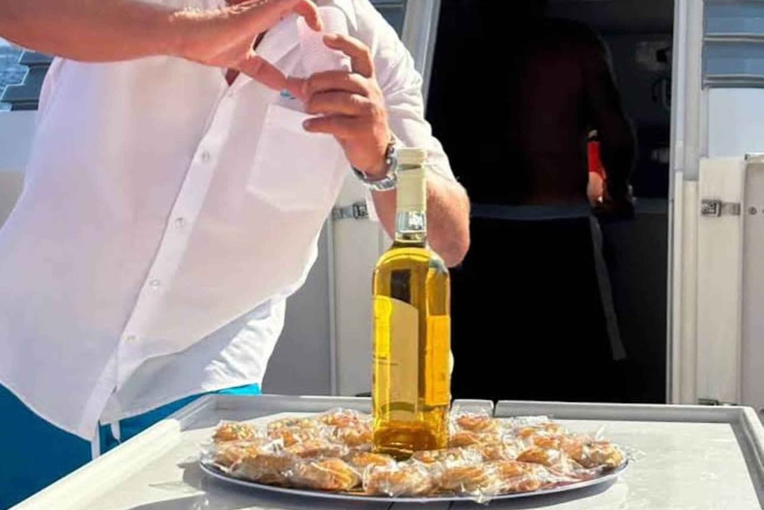Oppdag skjønnheten i Favignana og Levanzo med dette cruise fra Trapani. Ta en svømmetur i det turkise vannet og få litt fritid til å utforske landsbyen Favignana. Om morgenen kan du hoppe ombord på en romslig yacht i Trapani og slappe av mens du glir over havet til Egadi-øyene. Cruise langs kysten av Favignana og beundre de mest berømte buktene som Cala Azzurra, Bue Marino og Cala Rossa. Avkjøl deg med en dukkert i det krystallklare havet og svøm på fantastiske steder . Nyt en Pane Cunzato, en siciliansk sandwich med ost, tomat og ansjos, frisk frukt, vin og vann før du ankommer landsbyen Favignana. Tilbring en times fritid med å oppleve sjarmen til Favignana før du fortsetter til Levanzo Island. Ta panoramautsikt over den lille fiskerlandsbyen fra båten. Til slutt, gå til Cala Minnola for en siste svømmetur og avslutt turen på en søt tone når du prøver en typisk siciliansk dessert av mandelkjeks før du kommer tilbake til Trapani tidlig på kvelden.Includes