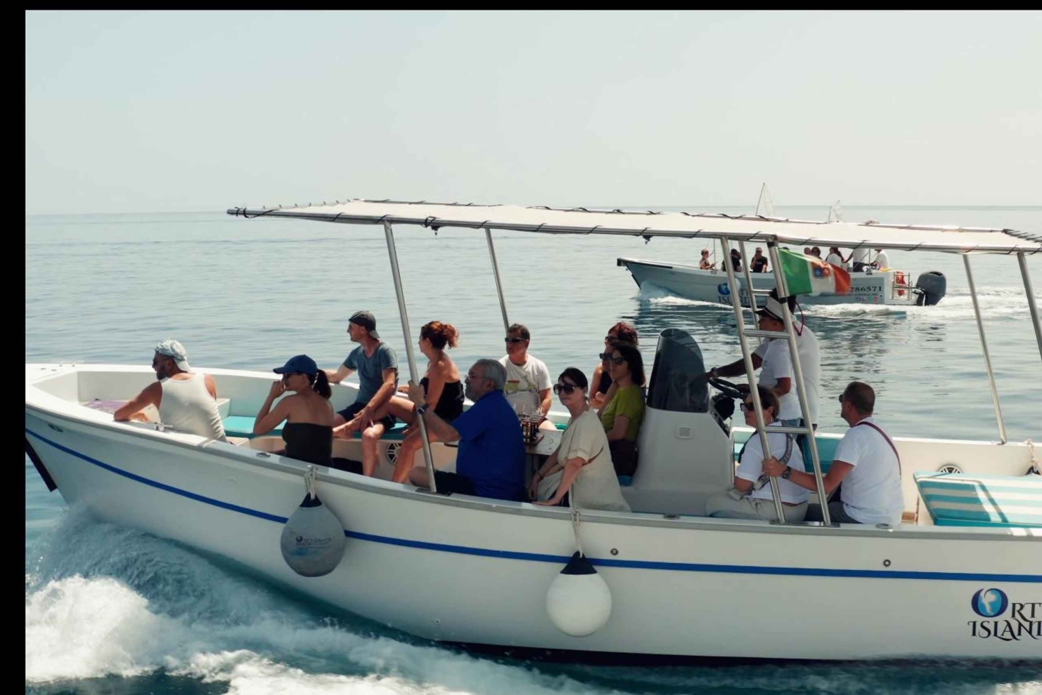Du drar fra havnen i Siracusa og går om bord på en elegant båt for en 90-minutters tur mellom natur og kultur. Etter ombordstigning krysser du Umbertino-broen og begynner å seile rundt øya Ortigia, der du kan beundre den store havnen, en av de mest spektakulære i Middelhavet. Du seiler i nærheten av Foro Italico, med utsikt over luksuriøse yachter og fasaden på katedralen (Duomo), og får deretter se den berømte Fonte Aretusa og det majestetiske Castello Maniace. Når du går ut på åpent hav, kan du nyte den unike utsikten over Ortigia fra sjøen, med sine kirker, fargerike fasader og gamle murer. Sjøreisen fortsetter mot nordkysten av Siracusa, hvor du får servert deg med frisk prosecco og sesongens frukt. Her nærmer båten seg havgrotene: Grotta dei Cappuccini, Grotta del Corallo og den pittoreske Grotta Grande, kjent for sine naturlige stalaktitter. Under turen er det planlagt stopp for bading og snorkling, med masker og briller tilgjengelig om bord. Det tradisjonelle stoppet foran Grotta dell'Amore (kjærlighetsgrotten) er perfekt for et minnebilde med en bakgrunn i form av et hjerte. Etter utflukten går du tilbake til kaia, med mulighet til å legge igjen en anmeldelse for å dele opplevelsen din.Includes