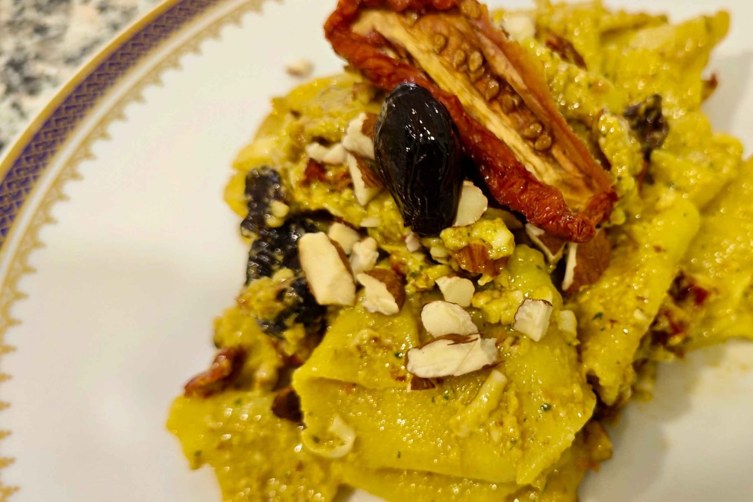 Makaron to niekwestionowana królowa Włoch. Co może być lepszego niż nauka robienia świeżego makaronu, aby pamięć Włoch stała się niezatarta? Aby było jeszcze lepiej, lekcję poprowadzi profesjonalny szef kuchni, który nauczy nas tworzenia świeżego makaronu z surowca, a także pokaże nam różne sposoby jego przyrządzania i przyprawiania, a wszystko to w profesjonalnym laboratorium kulinarnym. Lekcja będzie trwała około 2-3 godziny i w pierwszej fazie zostanie nauczone jak przygotować ciasto na makaron, zostaną wykonane dwa rodzaje ciasta: klasyczny makaron jajeczny oraz typowe sycylijskie ciasto z pszenicy durum, które będzie służyć do zrobienia: - Tagliatelle. - Nadziewany makaron. - Maltagliati. W drugiej fazie lekcji, gdy już przygotujesz własnoręcznie świeży makaron, możesz zacząć przygotowywać różne przyprawy i dowiedzieć się, jak to zrobić: - Ragu. - Norma. - Pesto sycylijskie. Na koniec szef kuchni dokończy dla Ciebie gotowanie makaronu, abyś mógł usiąść przy stole i cieszyć się degustacją makaronu i doskonałego sycylijskiego wina jak prawdziwe wille.Includes