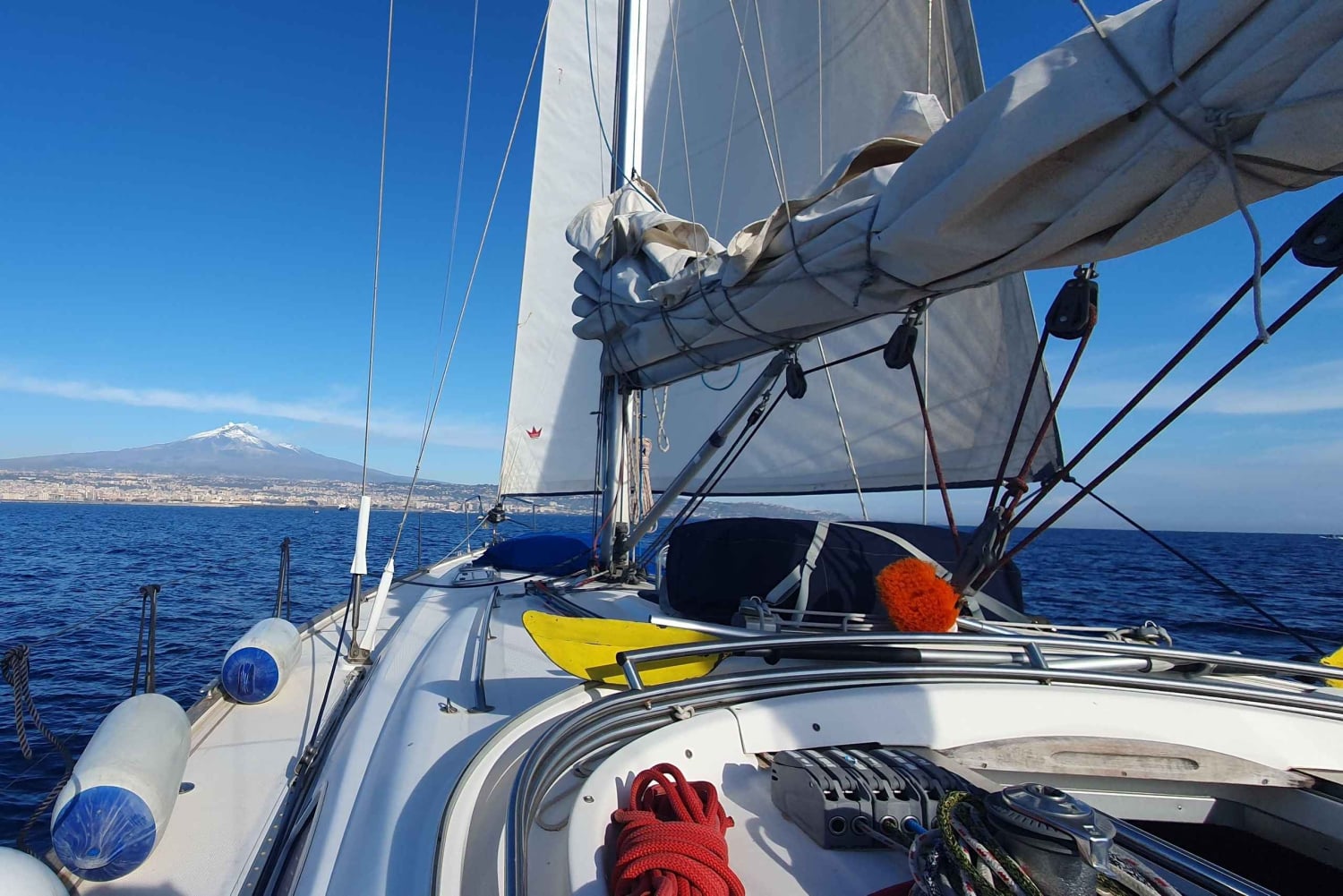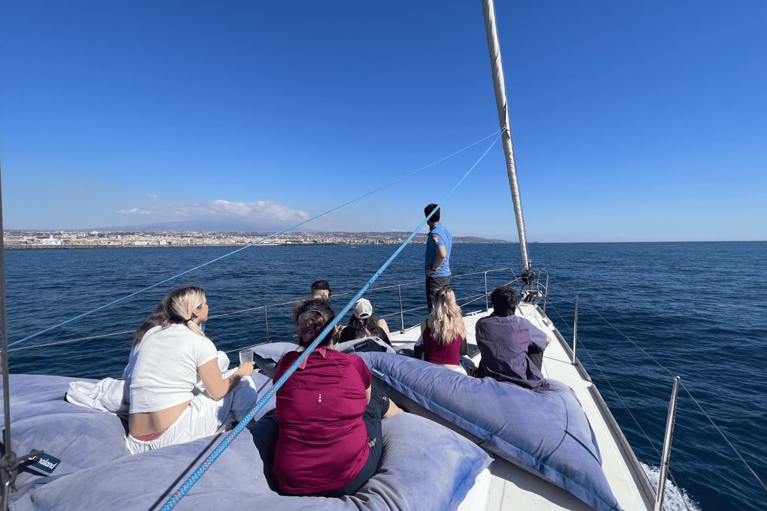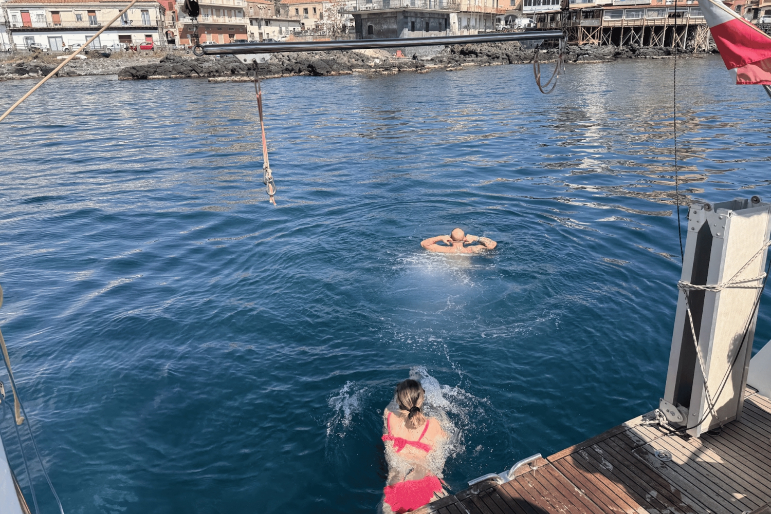 Saindo do porto de Catânia, você passará e admirará as rochas vulcânicas negras antes de fazer a primeira parada para nadar e talvez mergulhar com snorkel. De volta a bordo, você será servido com um rico aperitivo com produtos locais típicos da Sicília: pão caseiro, queijo local, legumes em óleo e especialidades de pistache siciliano. Em seguida, você seguirá em direção a Aci Trezza, onde terá a oportunidade de admirar a incrível costa com os antigos mirantes árabes ao longo da costa, construídos com rocha vulcânica há séculos. Você verá de perto os faraglioni de Aci Trezza, com o vulcão Etna sempre ao fundo. Tudo isso de uma perspectiva única que só o barco pode oferecer! Você voltará ao porto de Catania. O passeio tem duração de 4 horas e você pode escolher entre 2 horários: A opção da manhã ou a opção do pôr do sol. O barco é um Bavaria 46. O modelo do barco pode variar de acordo com a disponibilidade. Máximo de 10 pessoas a bordo. Partida: 09:30. Retorno: 13:30. Partida: 15:00. Retorno: 19:00.Includes