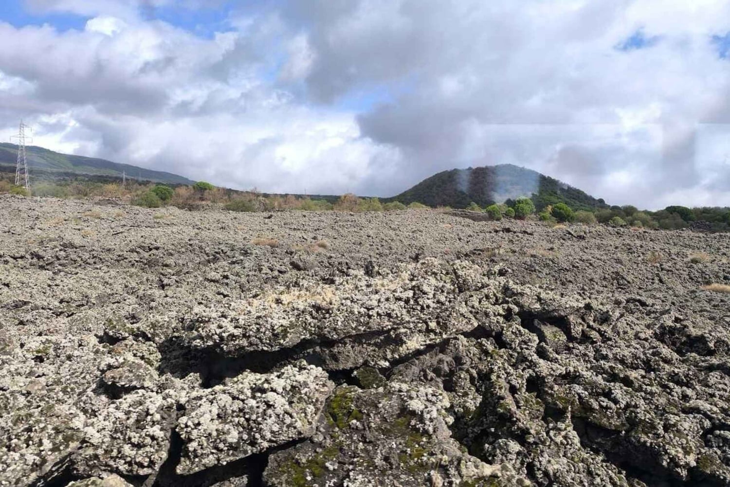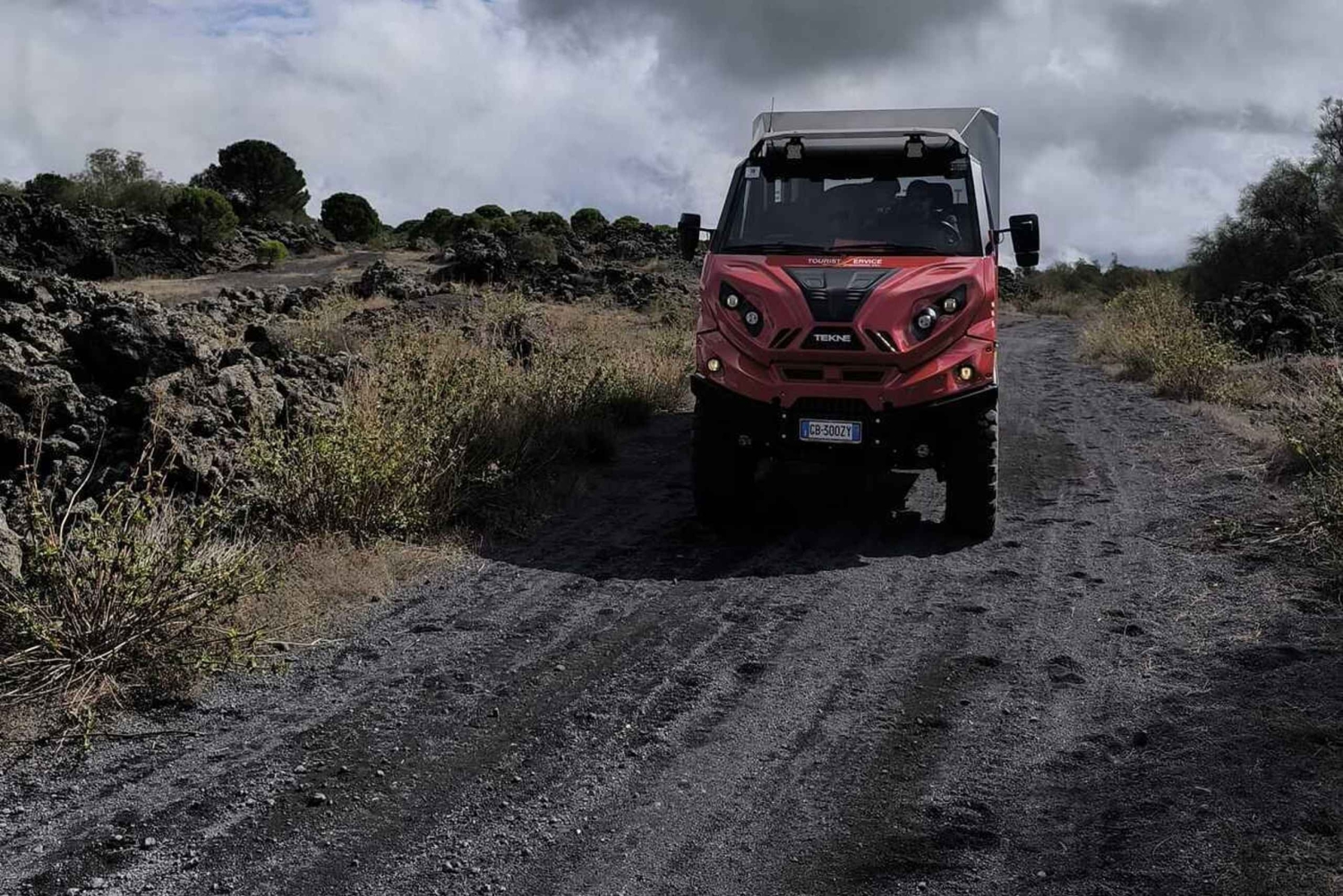 Etna Adventure Tour 4x4 Off Road från Catania till södra Etna, med en resplan som inkluderar: Cava Asero (Nicolosi), Pineta Serra La Nave, Teseo Screpolato, sista stoppet vid Rifugio Sapienza (1910 m).