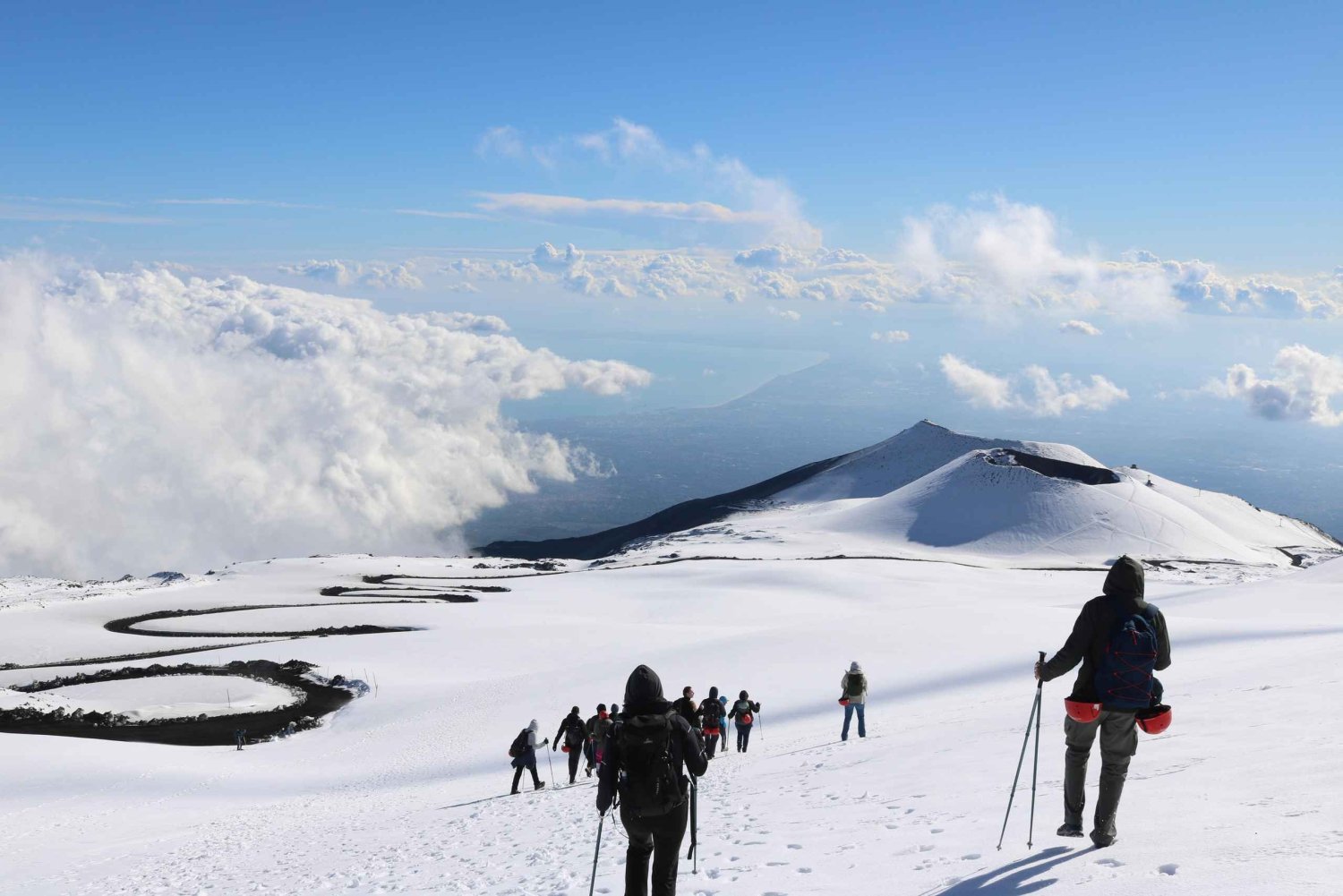 Ta dig upp på toppen av Etna i tryggt sällskap av auktoriserade bergs- och vulkanguider för en unik upplevelse på Europas högsta aktiva vulkan. Starta från Rifugio Sapienza-området, på cirka 1900 meters höjd, och ta linbanan som tar dig till cirka 2500 meters höjd. Börja vandringen genom platserna för de senaste och viktigaste utbrotten tills du når den högsta punkt som tillåts enligt gällande föreskrifter som utfärdas enligt vulkaniska risknivåer, som ständigt förändras. Efter att ha stannat i ca 30 minuter för att äta något, beundra det omgivande landskapet och ta några bilder, klättrar vi upp till Barbagallokratrarna (utbrott 2002/03), går ner på deras östra flank och styr mot den spektakulära Valle del Bove, som är en gammal caldera och som, vilket nyligen genomförda studier har visat, bildades för ca 9000 år sedan genom att Etnas gamla utbrottscentra kollapsade. Vi fortsätter sedan i sydlig riktning tills vi når basen av den krater som bildades under det stora utbrottet 2001. Efter att ha korsat denna går vi i riktning mot linbanan som tar oss tillbaka till vår startpunkt.Includes