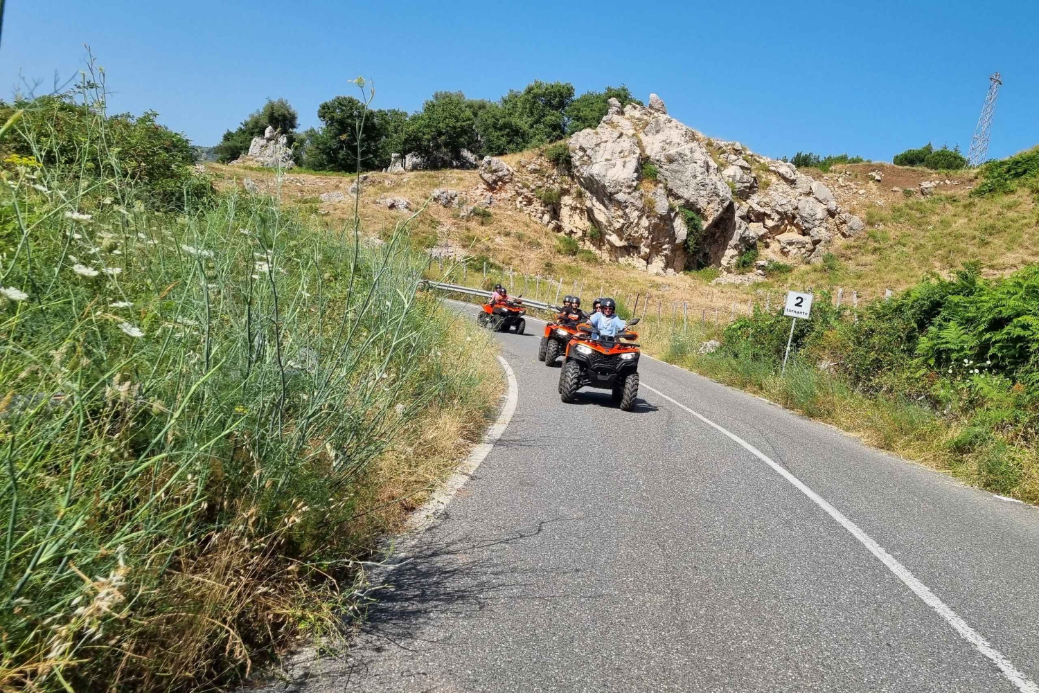 Rundtur av Rocca 1,5 timmar: Avgång från restaurang-pizzeria 'Il Castello', vi kör längs en sträcka av statliga vägen och gör sedan en rundtur vid foten av Rocca Salvatesta (även kallad Siciliens Cervino), Ritagli di Lecca, floden under Ponte Badia Vecchia, som är en del av Novara di Sicilia. återkomst till restaurang-pizzeria 'Il Catello' för att skåla bekvämt sittande med en läcker aperitif med typiska produkter från Novara di Sicilia, som kan väljas med eller utan alkohol. Vi tillhandahåller försäkring, regnjacka vid oväntat regn, dammmask, hygienisk huvudbonad, hjälm och vatten så att du kan slappna av under din fantastiska utflykt. Körkort B/B1 är obligatoriskt för föraren, minimiålder för passagerare är 7 år.Includes